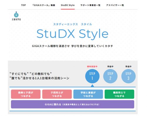 「StuDX Style」は、1人1台端末の利活用をスタートさせる全国の教育委員会・学校に対する支援活動を展開するため、「すぐにでも」「どの教科でも」「誰でも」活かせる1人1台端末の活用方法に関する優良事例や本格始動に向けた対応事例などの情報発信・共有を実施している文部科学省のサイトです。